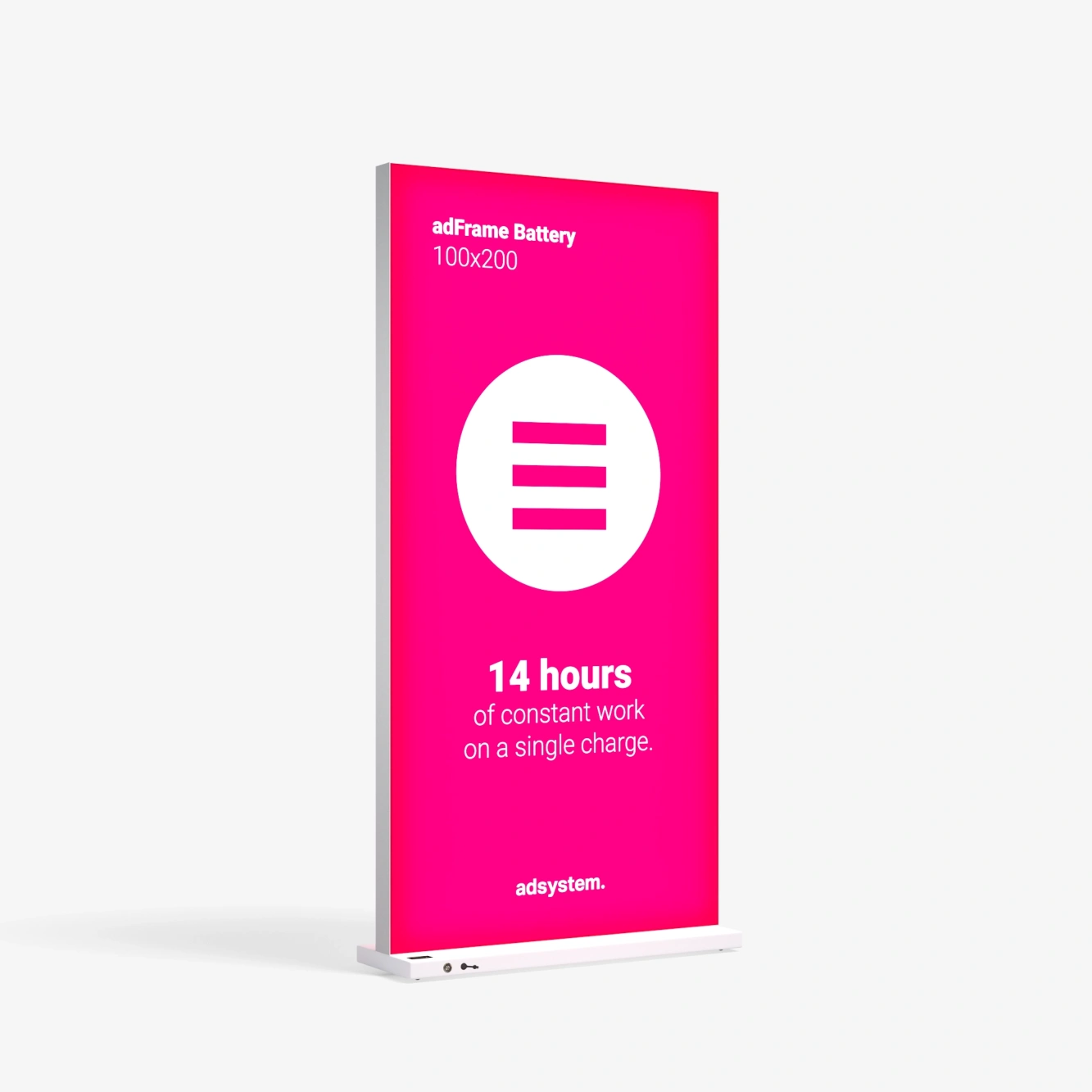 Composée d’un cadre en aluminium et d’une impression textile, la structure ne nécessite aucun outil pour son montage. L’impression de haute qualité peut être remplacée selon les besoins des campagnes promotionnelles. De plus, les caissons lumineux adFrame Battery peuvent être connectés entre eux, permettant la création d’une structure élargie adaptée aux salons, institutions culturelles et centres commerciaux.