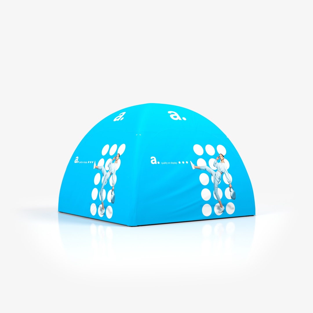 adTent Air Premium est une tente de réception gonflable que vous utiliserez non seulement comme protection contre les intempéries, mais aussi comme support publicitaire. Nous imprimons le matériel recouvrant la structure avec le graphisme de votre entreprise, de sorte que la tente publicitaire attire l’attention de votre public et l’incite à se rendre à votre stand. La tente gonflable présentée ici est basée sur une armature à pression constante, qui maintient un niveau d’air constant grâce à des valves spéciales.
