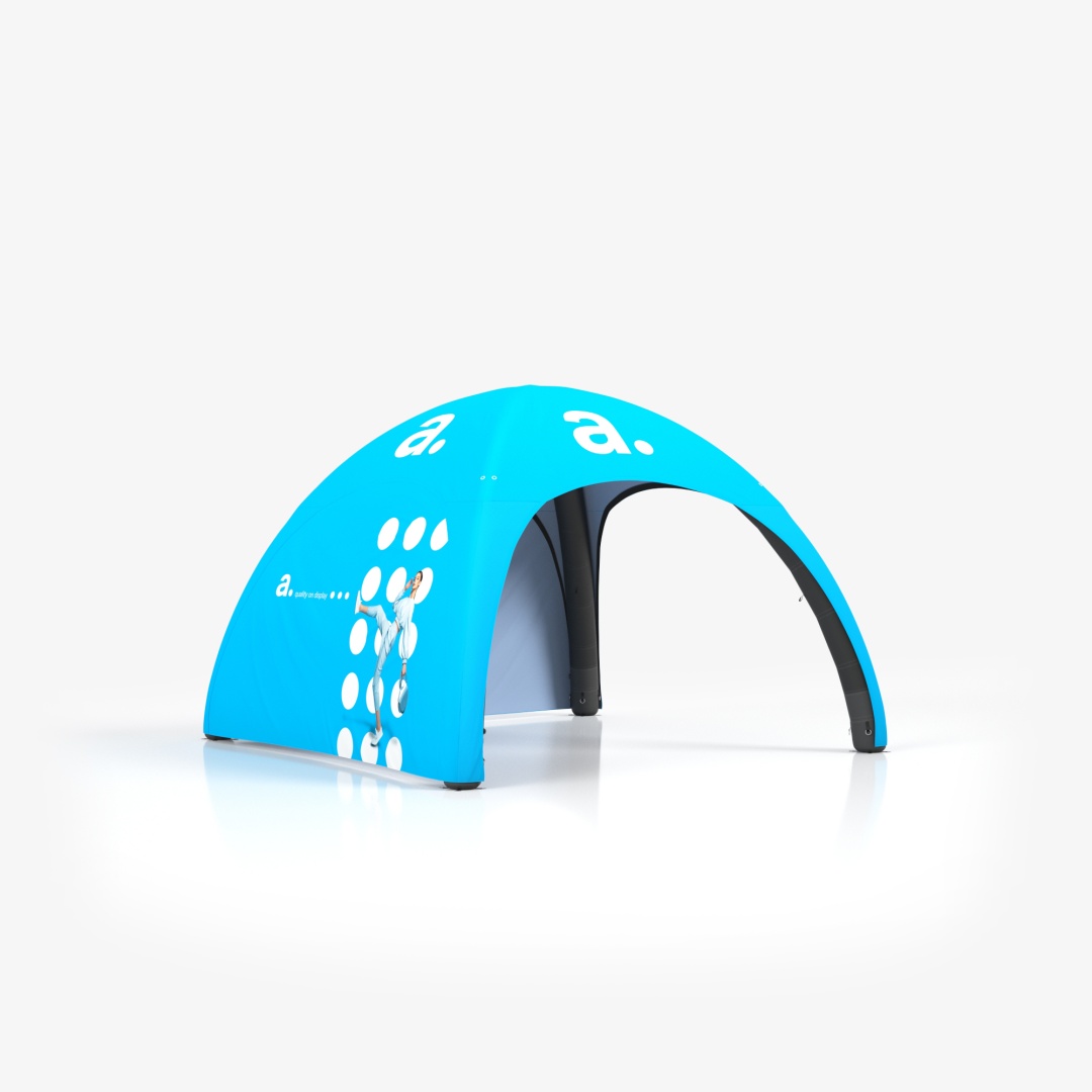 adTent Air Premium est une tente de réception gonflable que vous utiliserez non seulement comme protection contre les intempéries, mais aussi comme support publicitaire. Nous imprimons le matériel recouvrant la structure avec le graphisme de votre entreprise, de sorte que la tente publicitaire attire l’attention de votre public et l’incite à se rendre à votre stand. La tente gonflable présentée ici est basée sur une armature à pression constante, qui maintient un niveau d’air constant grâce à des valves spéciales.