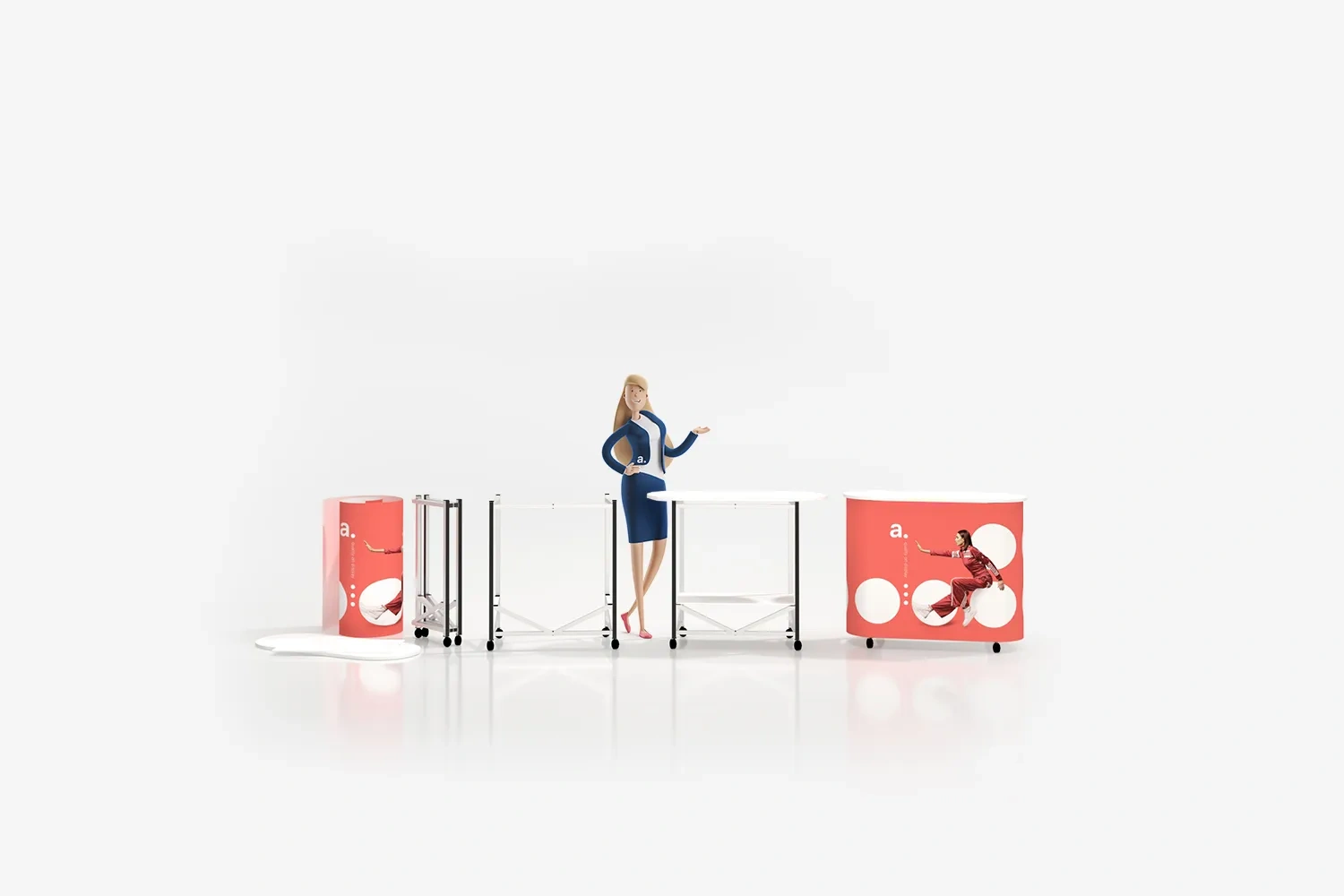 En Promotion dans un magasin ou une galerie: le comptoir mobile de foire est un système réutilisable avec lequel vous pouvez facilement adapter lapparence de votre comptoir stand en fonction de vos campagnes promotionnelles actuelles.