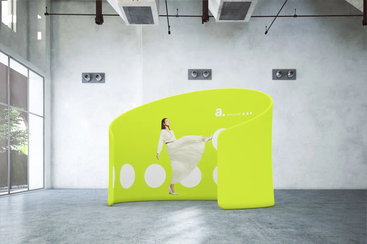 Le stand adWall Vario Island est un stand commercial en forme d’île, qui se distingue par son design inhabituel. L’utilisation de ce produit assurera une visibilité encore plus grande à votre marque lors des événements d’exposition les plus variés. Le produit se compose d’une structure en aluminium encliquetable et d’une impression textile.